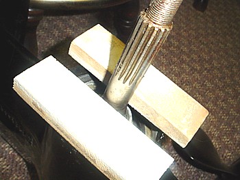 Put your prop on the shaft against the 2 wooden blocks. Use a large washer and your prop nut to pull the carrier 3/4 of an inch out of the housing.Note !You can only pull the carrier out this way about 3/4 of an inch or until you feel the shift lever looseness getting tight. When the shift lever gets tight, remove the prop and reach in and you should be able to pull the carrier out the rest of the way with your fingers.